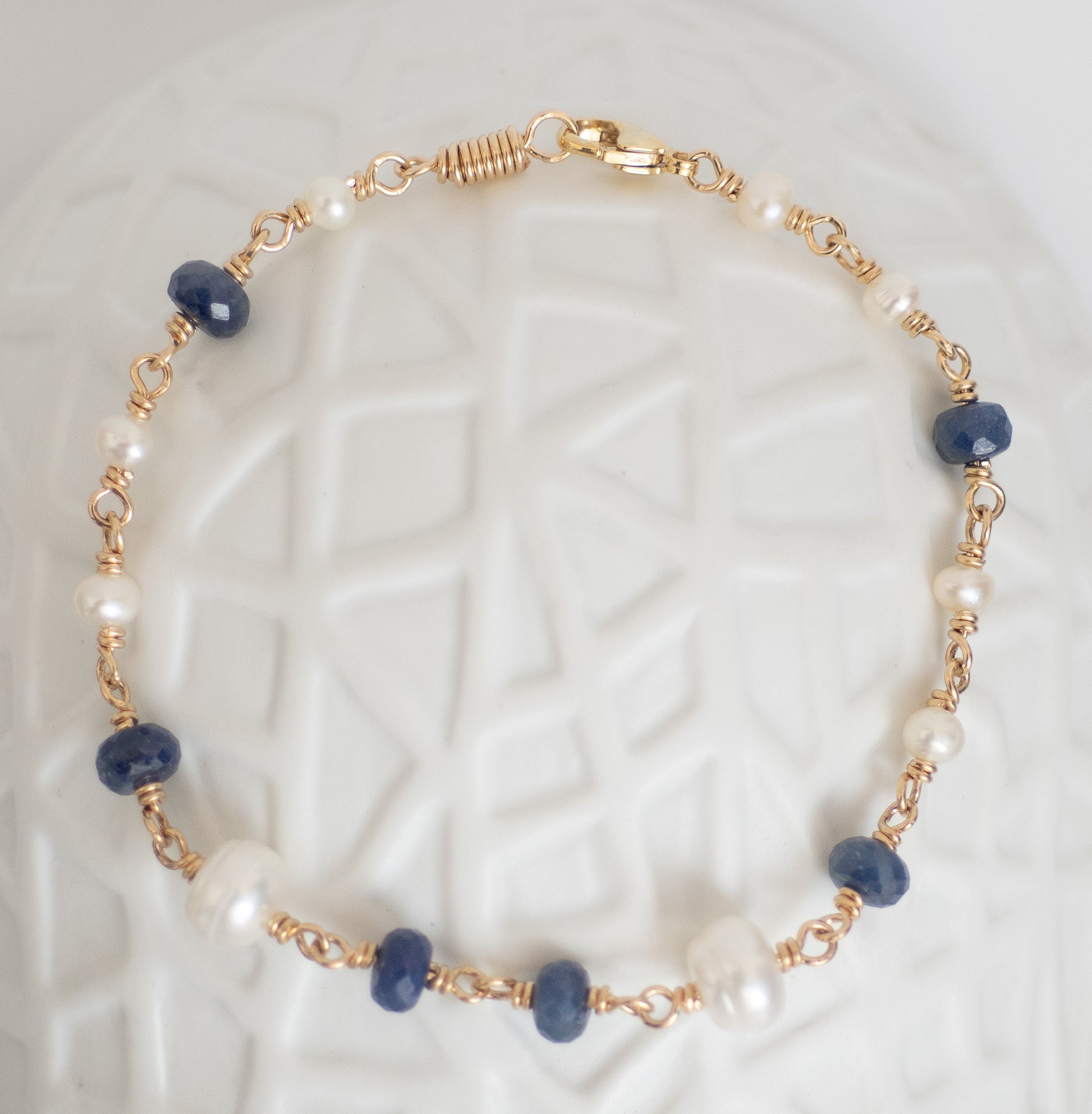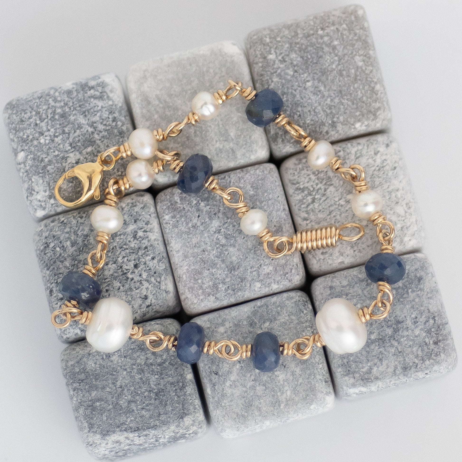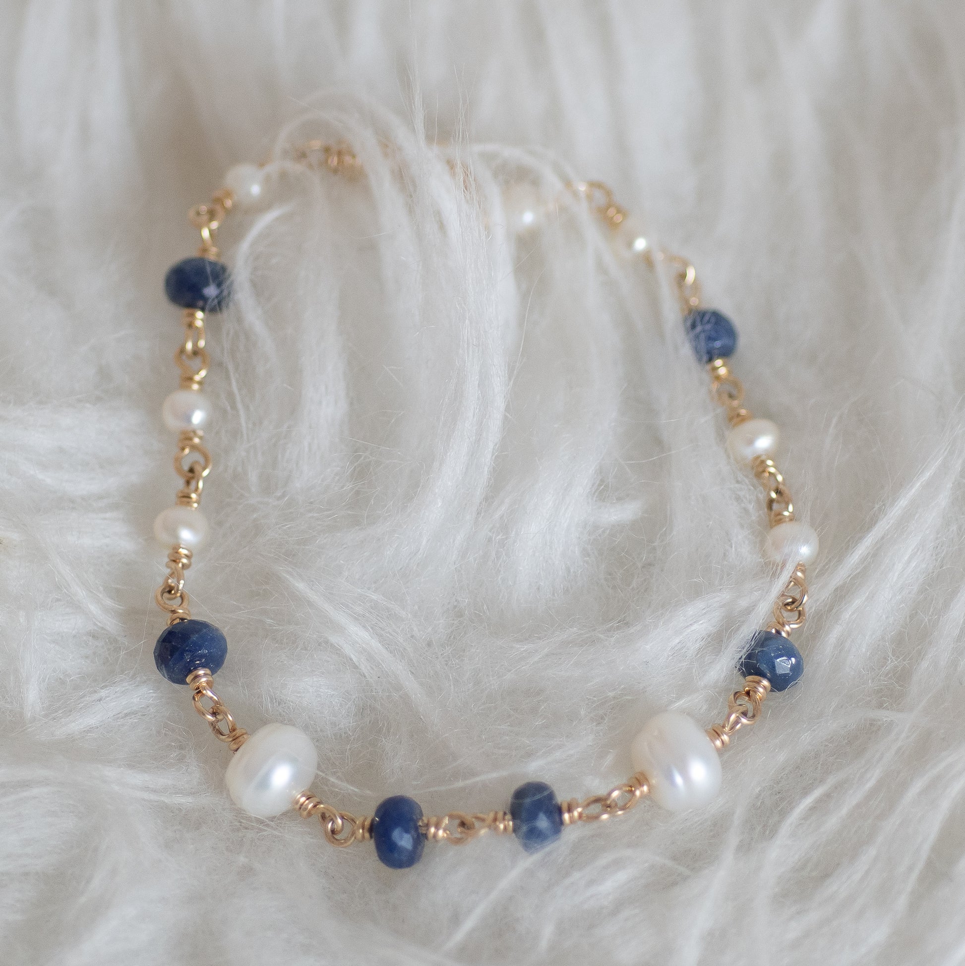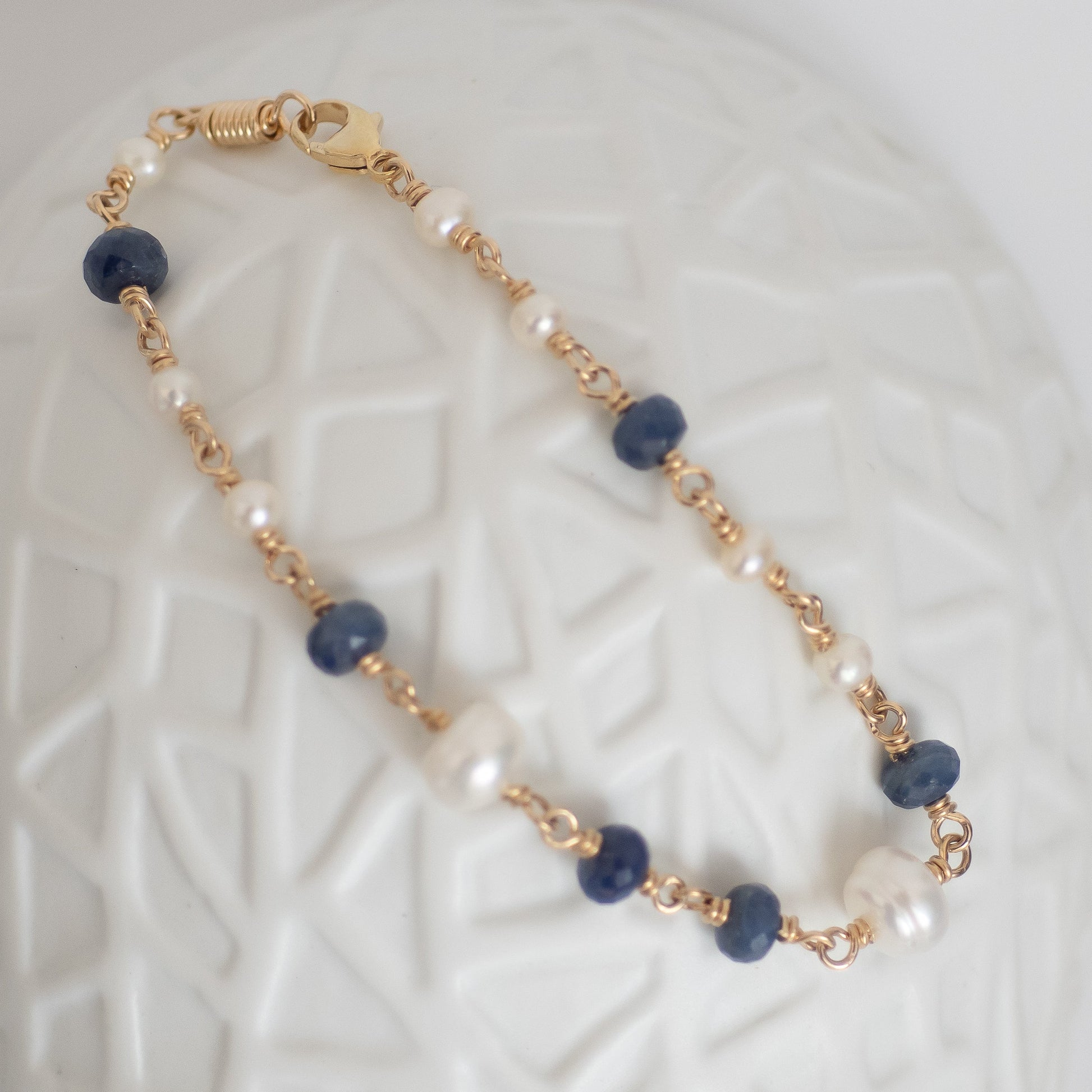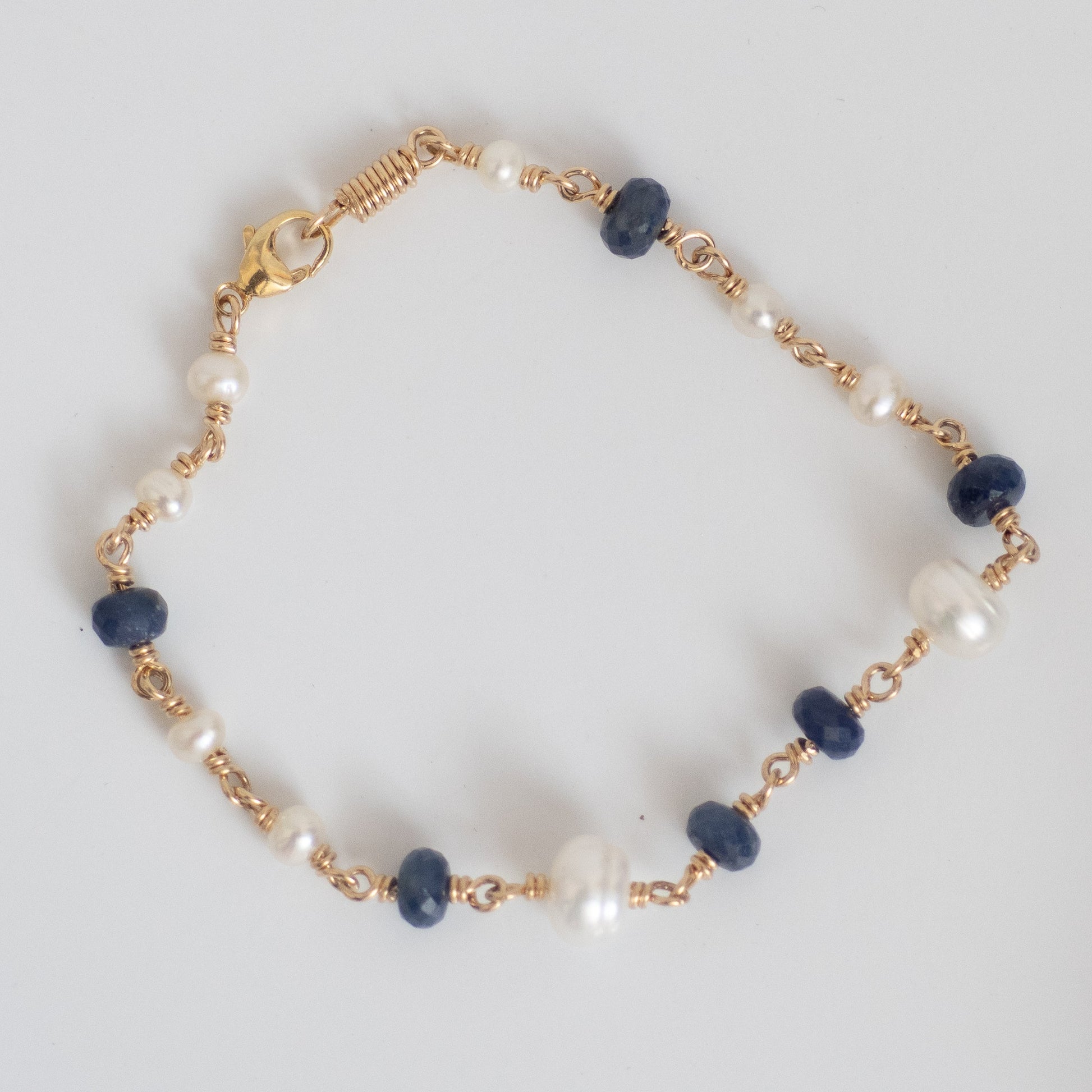 This handcrafted bracelet features a timeless pairing of deep blue Sapphire and freshwater cultured pearls, each element individually wire-wrapped by hand along a gold-filled chain for lasting beauty and durability. The rich depth of the sapphire contrasts gracefully with the soft, natural luster of the pearls, creating a design that feels both classic and contemporary.