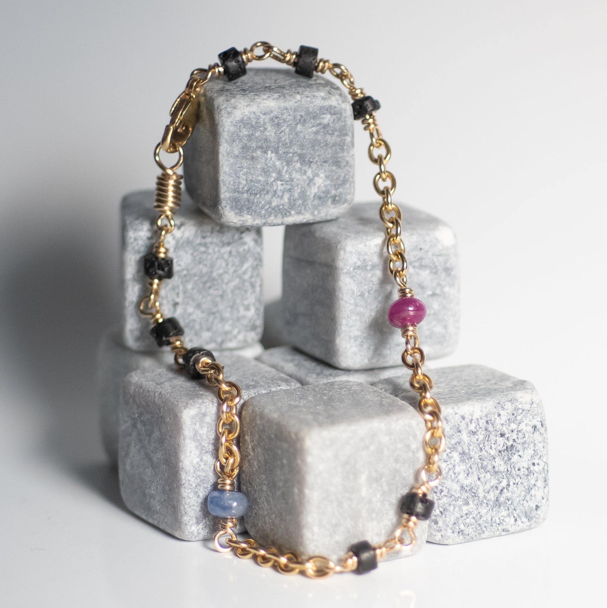 This handcrafted bracelet features a vibrant blend of Ruby, Blue Sapphire, and Black Lava, each stone individually wire-wrapped by hand along a gold-filled chain for durability and timeless appeal. The mix of deep reds, fresh greens, rich blues, and soft iridescence creates a beautifully balanced and eye-catching piece.